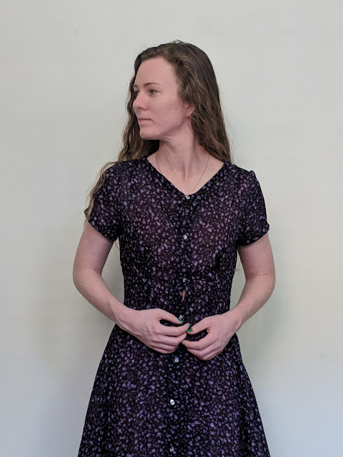 The fabric is a poly crepe georgette so it can get a bit sticky, but it has a great drape and flows nicely which generally means it's airy and cool most of the time. It is prone to fraying, so all seams and hems are overlocked. The colour is a beautiful rich deep purple, with delicate light and mid-purple flowers. The fabric is quite light and partially see-through so while it's not particularly obvious when looking at it, it does require a slip to be worn underneath.
