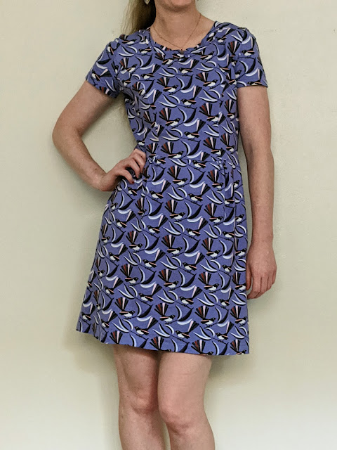 The fabric is a Jocelyn Proust design from Spotlight, with a Willy Wagtail print. Jocelyn Proust makes great fabrics, mostly with Australian flora and fauna prints. The pattern is Vogue 9199. It's a Very Easy Vogue pattern, and I don't think I've made one before. I was looking for a simple knit dress pattern and this was what I could find. I almost dismissed it because the illustration on the front isn't great, but I was wanting a pattern to make a dress to take on holiday so had to go with what was available.